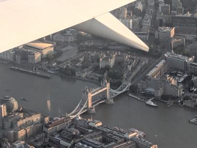 | もう眼下には、テムズ川。 ヒースロー空港着陸前に、ロンドン市内上空を通る。 ロンドンアイ(観覧車)が見える。 タワーブリッジも見える。 予習をもっとしておけば、いろいろなことがわかったかな。 |