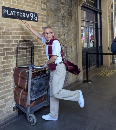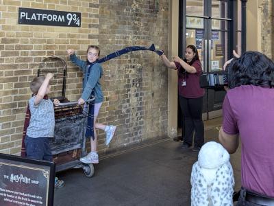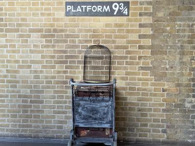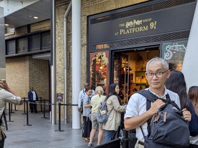 | ハリー・ポッターで有名なキングス・クロス駅の9と3/4ホームを見に行く。 駅の改修工事で、9と3/4ホームの柱はなくなってしまったけど、かわりにハリー・ポッターのお店ができて、壁にカートが刺さっているフォトスポットができている。 お店のお兄さんが、カメラマン。マフラーをヒラヒラさせる係のお姉さん。店内で、有料で写真を買うことも出来ますが、スマホで撮ってもOK。 |