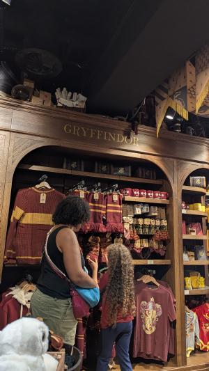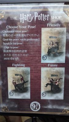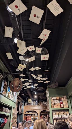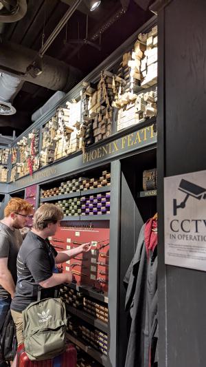 ハリー・ポッターの4つの寮のそれぞれのマフラーを貸してくれます。それを知らなかったので、日本からグリフィンドールのマフラーを持って行ったので、妻とおそろいのマフラーで、写真を撮ることができました。 お店のなかは、魔法の杖のお店の雰囲気や、手紙が飛んでくるシーンなど、ハリー・ポッターの世界観を感じられる。 |