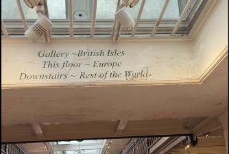 白い梁の部分に書かれた 緑色の文字の標示 ギャラリー〜イギリスの島々 このフロア〜ヨーロッパ 地下〜その他の世界 |
